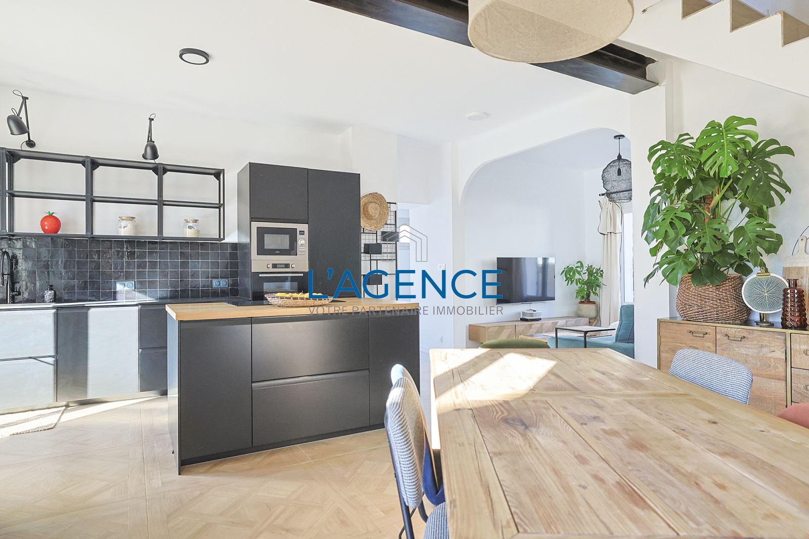 Elle se compose au rez de chaussée d'une entrée, d'un spacieux salon/salle à manger de 45m² baigné de lumière au Sud ; ainsi qu'une belle cuisine ouverte moderne et equipée.