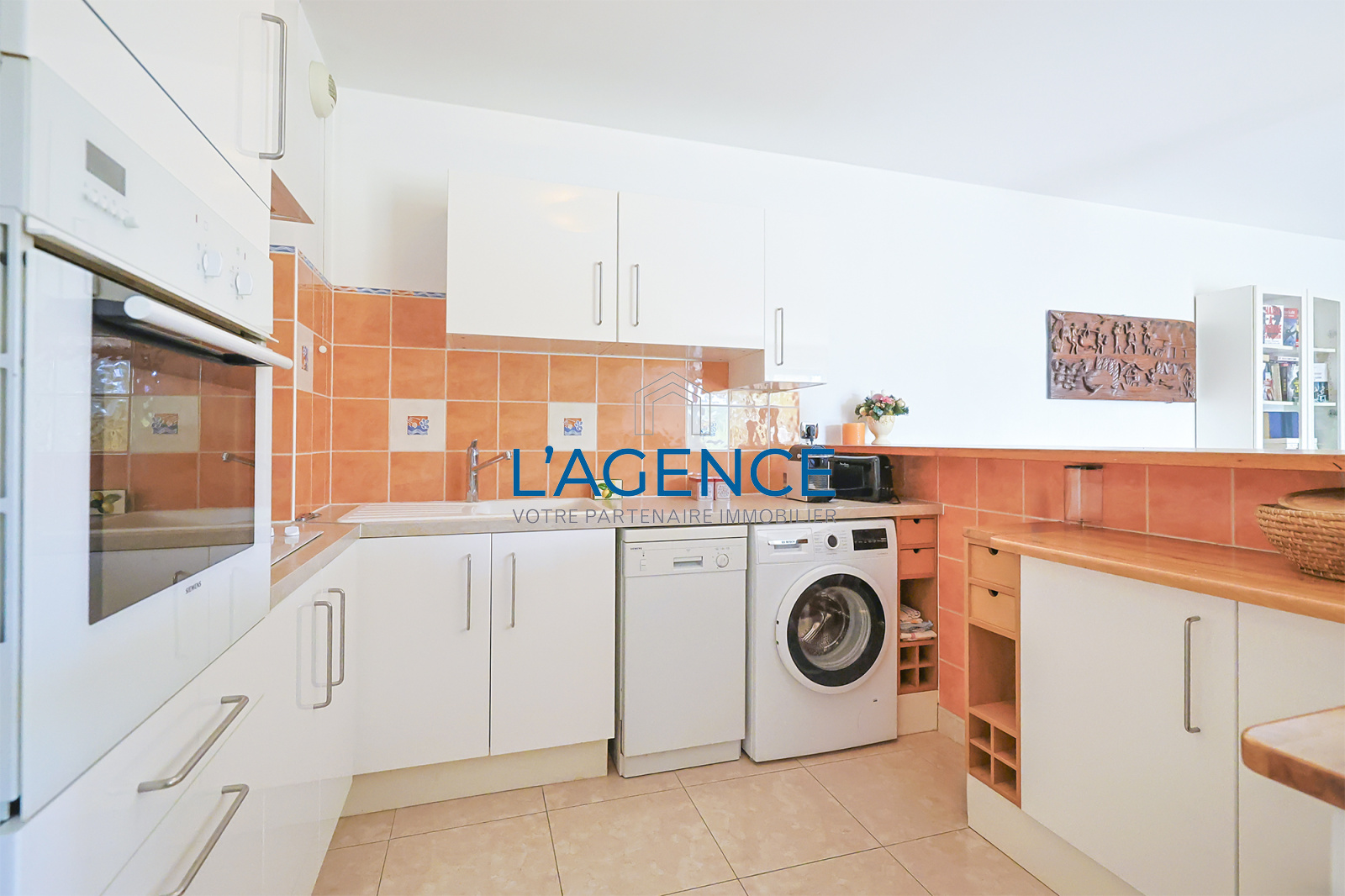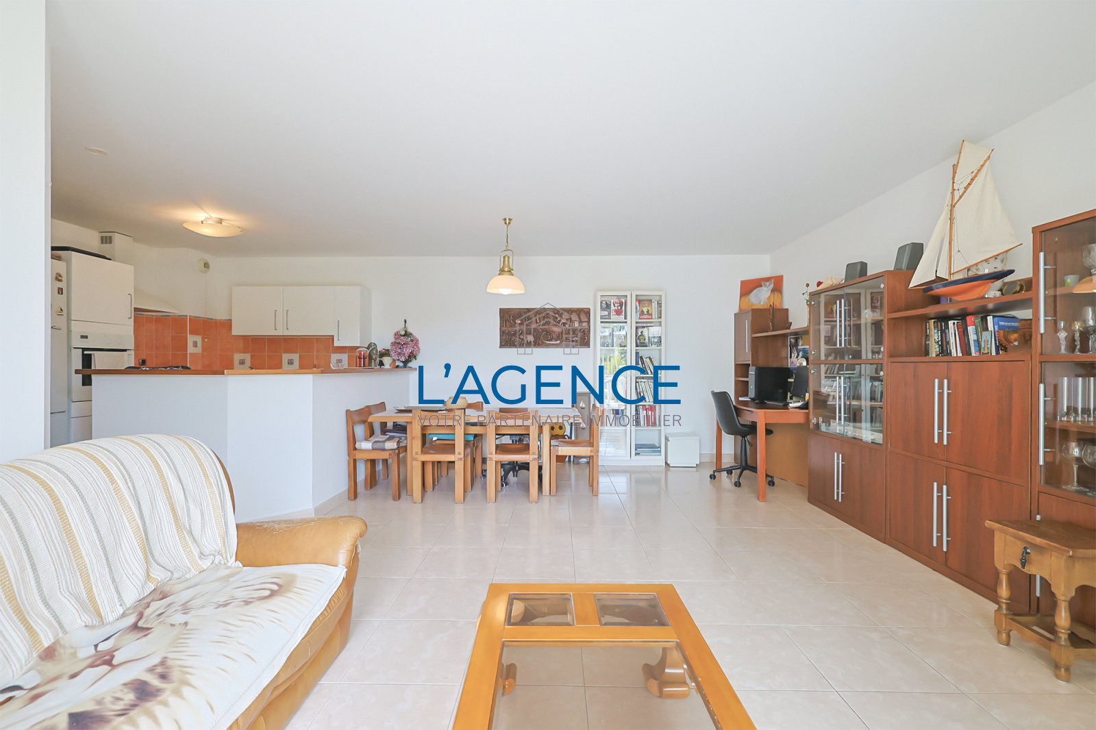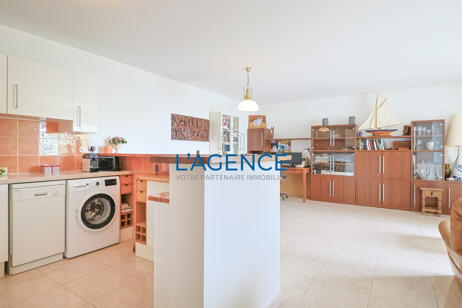 Vaste séjour ouvert sur cuisine de 34 m² ouvrant sur terrasse, 2 chambres avec placard ; dégagement avec rangement , WC séparé avec lave-mains, salle de bain. Deux garages en sous-sol.