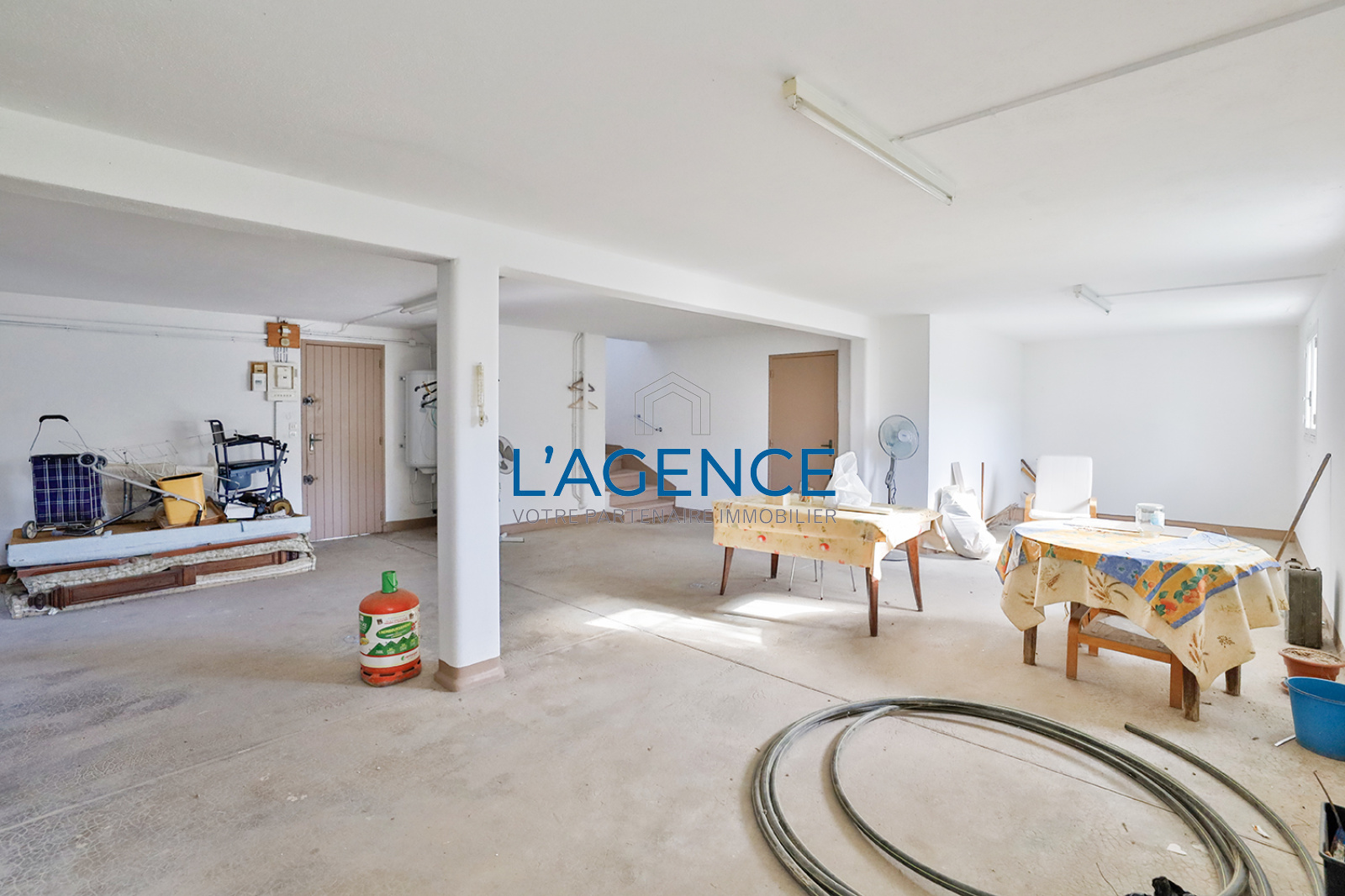 La villa se compose au rez de chaussée d'un garage de 16m² et d'une partie habitable (ancienne salle de coupe ) de 60 m² avec WC et point d'eau.