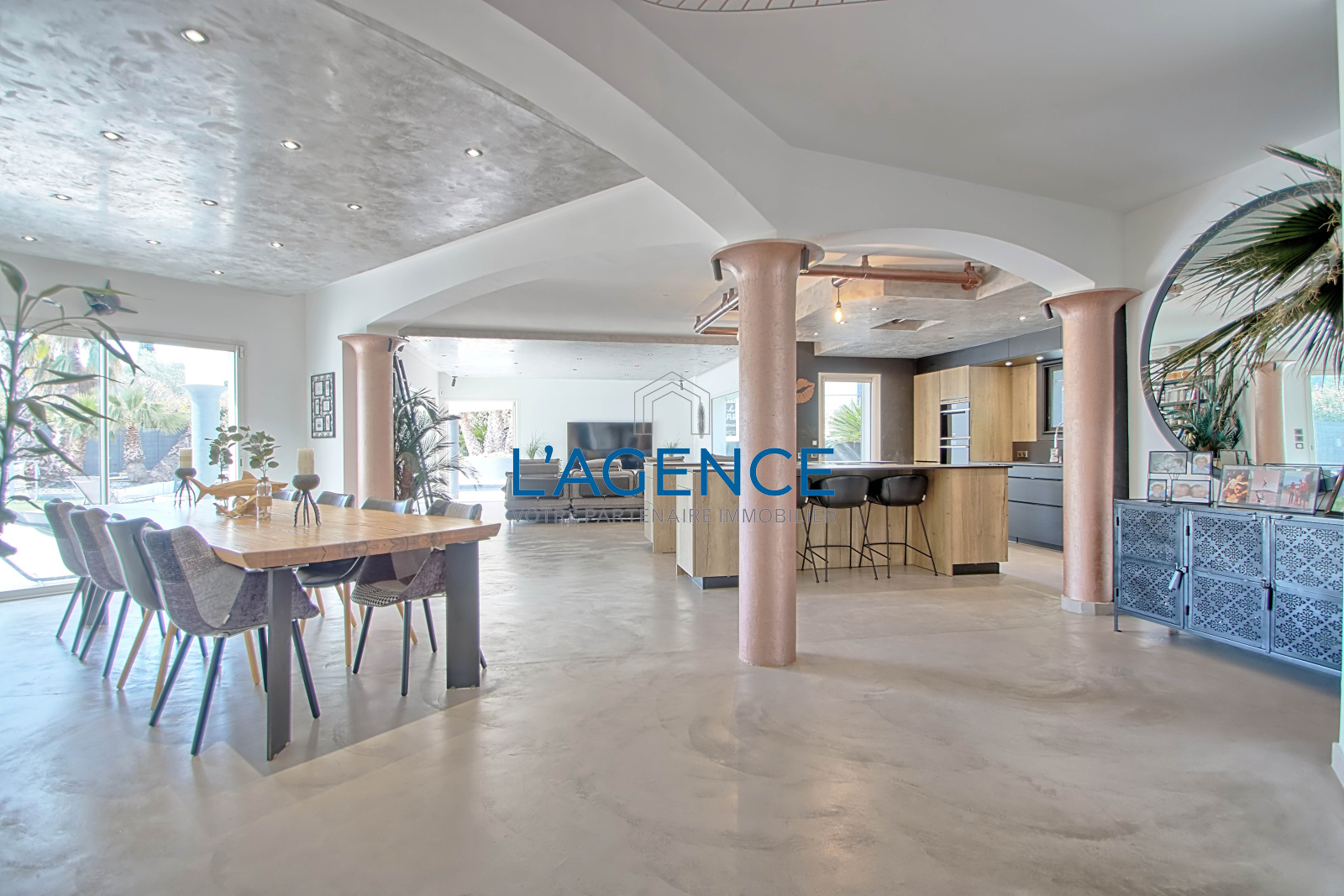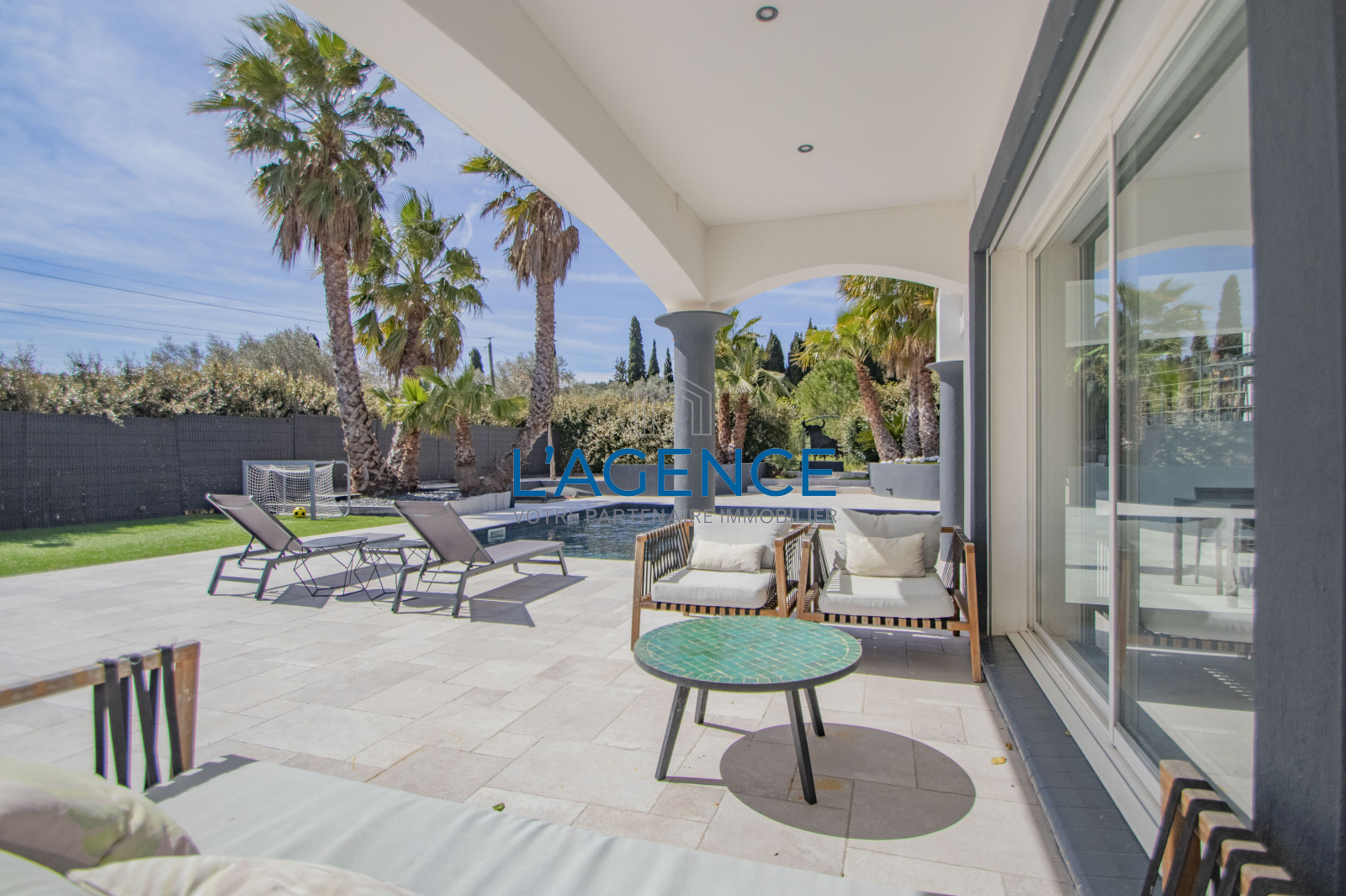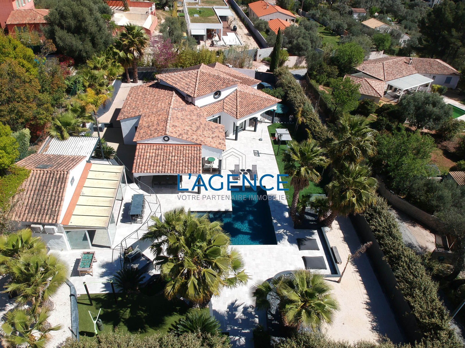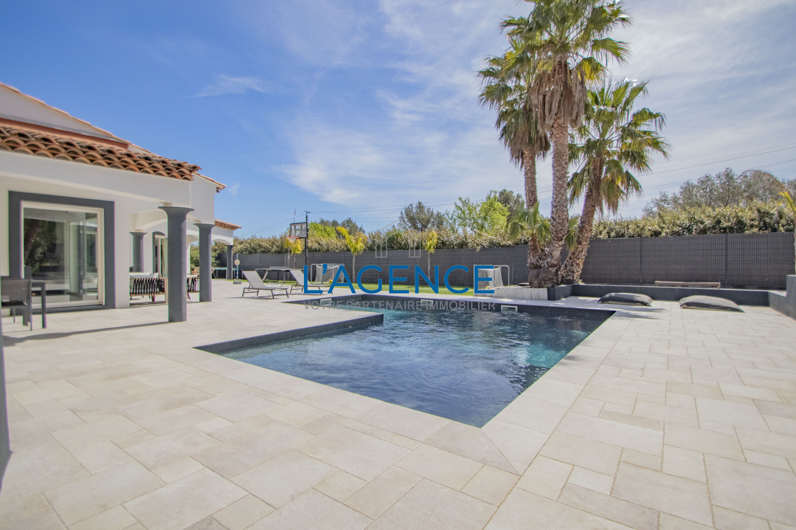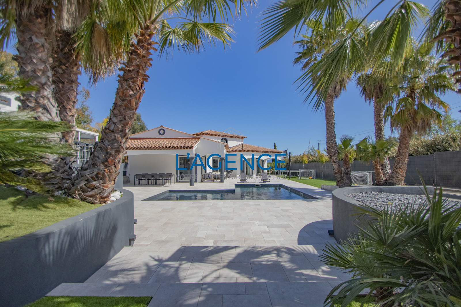Les extérieurs sont entièrement pensés autour de larges terrasses et espaces verts, des essences méditerranéennes et grands palmiers autour de l'espace piscine (8X5m) , de son espace détente ou convivialité (barbecue plancha) avec vue sur la pisicne et le jardin. Vous pourrez profiter d'une seconde partie de la propriété, un jardin de 600m² , ou même construire un carport en bois.