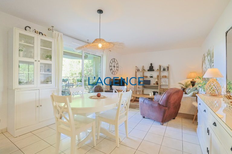 Hyères Ouest dans résidence de standing, Appartement de type T3 de 65m² au premier étage avec ascenseur. Il se compose d'un salon séjour cuisine de 30 m² ouvrant sur une terasse de 12 m² exposé au Sud. Dégagement avec placard, salle d'eau, WC séparé. 2 chambres dont une avec placard et une autre ouvrant sur une terrasse ouest de 9 m². Cellier sur le palier. Garage avec électricité. Exposition Sud Ouest . Appartement au calme. Copropriété verdoyante et arboré. A 10 minutes du plein centre ville à pied.