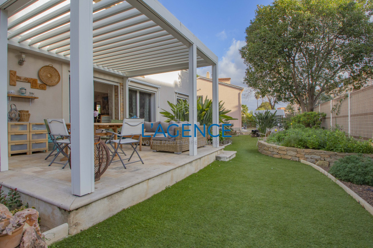 Hyères gare villa T4/5 individuelle de 139 m2 entièrement rénovée par un architecte offrant de très beaux volumes, accès aux commerces à pied, composée d'une belle entrée desservant un séjour double de 46m2 offrant un beau volume avec son plafond cathédrale. Le salon ouvre sur une véranda bio climatique. Grande cuisine aménagée et équipée de 14 m2. Une chambre de plain pied de 12 m2 avec placard, salle d'eau avec wc. A l'étage, 2 chambres dont une de 24 m2 avec bureau pouvant être fermée afin de réaliser une 4ème chambre. Jardin arboré de 542 m2. Garage. Cette villa offre de nombreuses prestations soignées (climatisation, double vitrage, volets électriques). Commerces de la gare et du centre ville à pied au calme.