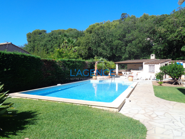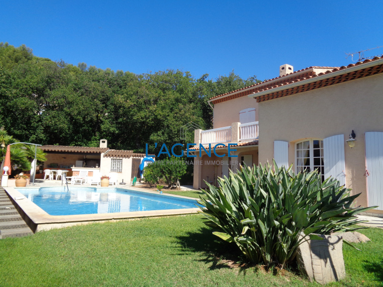 Hyères proche mer, Villa individuelle de 200m2 édifiée sur un terrain magnifiquement arboré de 1530m2 avec piscine pool house et garage. Elle se compose d'un vaste séjour de salon de 70m2 ouvrant sur le jardin sa piscine 10x5 et son pool house et une terrasse. Mezzanine avec coin bureau. Grande Cuisine séparée. 5 chambres dont deux de plain pied avec salle d'eau, 3 autres à l'étage avec salle de bains dont une ouvrant sur une terrasse. Bel ensoleillement. Jardin arboré de 1530m2. Garage, vide sanitaire Au calme en impasse. Une villa baignée par la lumière de part son exposition sud. A moins de 2 kilomètres des plages de l'Almannare.