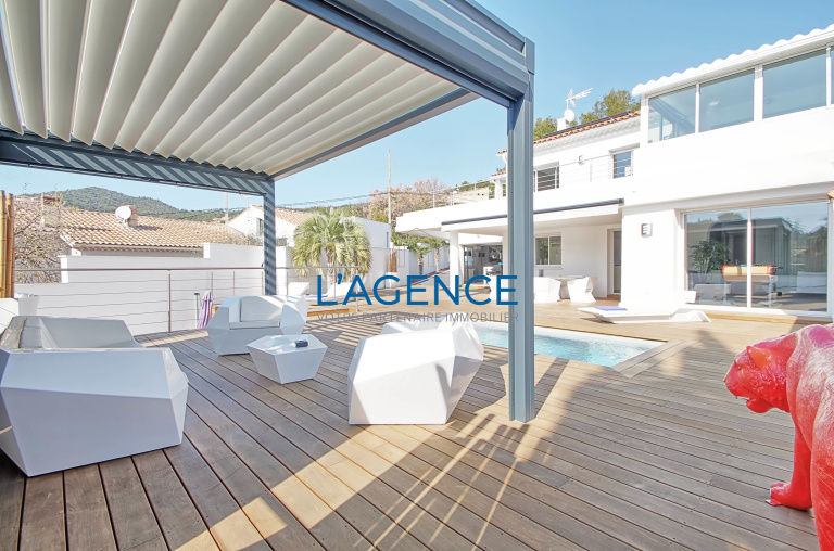 Hyères dans un secteur résidentiel Villa d'architecte de 200 m2 entiérement rénovée en 2018 sur un terrain de 700 m2 offrant de tres belles prestations et une vue dégagée allant jusqu'a la mer .