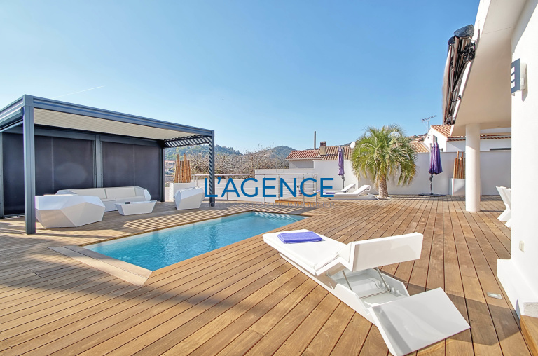 Cette villa propose un vaste séjour de 70 m2 avec cheminée et cuisine us aménagée et équipée ouvrant sur une terrasse de 200 m2 en IP avec une piscine et une pergola bio climatique avec espace repas et dans le fond du jardin un espace à l'abri des regards indiscrets avec spa . Elle offre 4 chambres dont une de plain pied avec salle d'eau et dressing de 29 m2 . A l'étage 3 autres chambres dont une de 31 M2 avec salle d'eau . Salle de bains . Une large terrrase à l'étage est accessible des chambres offrant une vue dégagée jusqu'a la mer et la villa