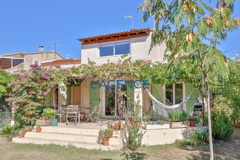 Hyères Ouest en impasse, villa T5 de 135 m² mitoyenne d'un seul côté et exposée au Sud avec garage et terrain arboré de 505 m² au calme. Dès l'entrée un séjour double de 32 m² ouvrant sur une belle terrasse et son jardin. Cuisine séparée, aménagée et équipée avec dans le prolongement accès au garage. Une chambre de plain pied de 11 m² avec sa salle d'eau et son wc complète la partie du rez de chaussée. A l'étage un dégagement ouvre sur 3 chambres dont une de 20 m² avec grand placard et une autre de 14 m². Salle de bains avec double vasque.