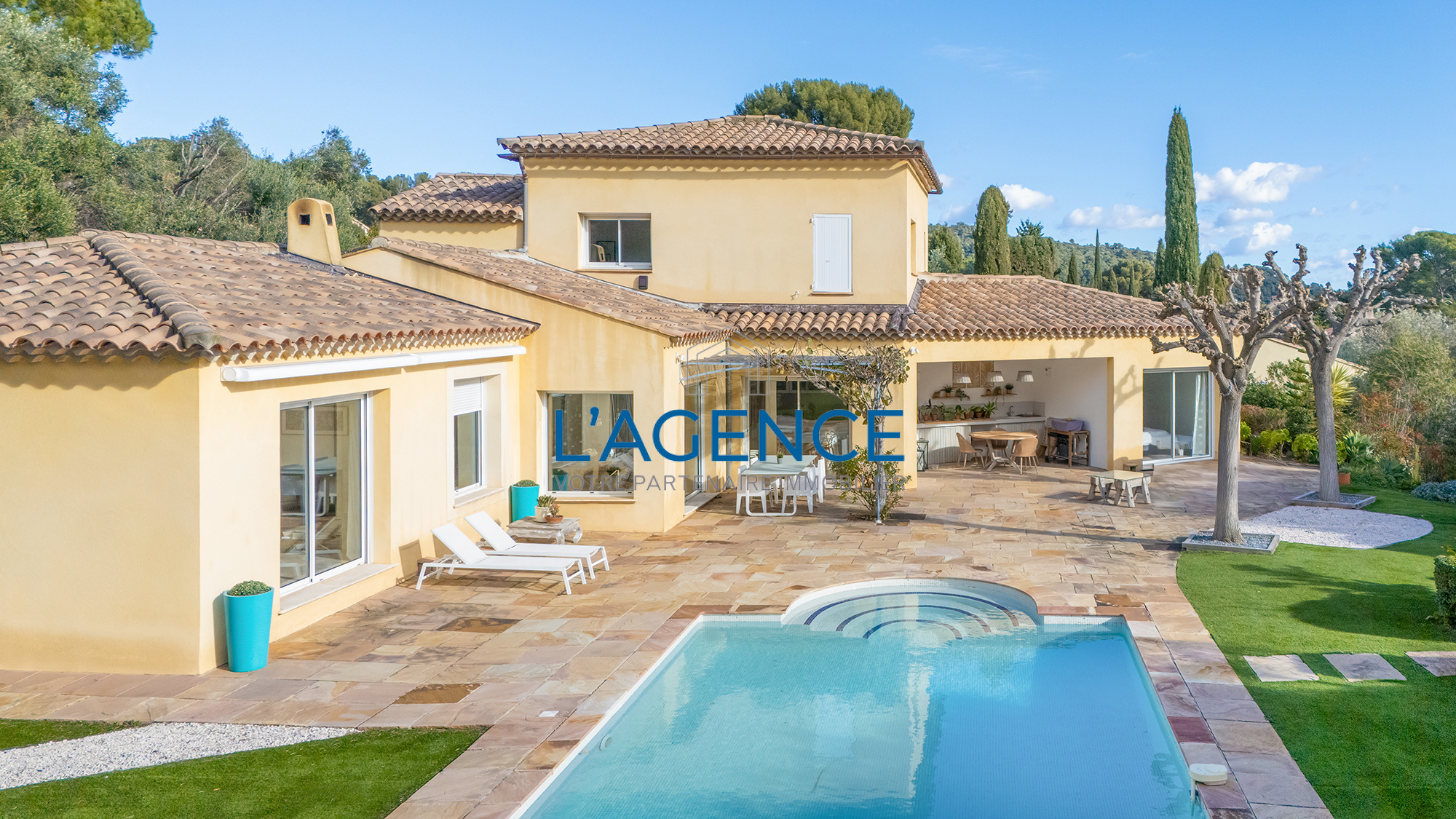 La villa bénéficie de prestations haut de gamme : sol en travertin, matériaux de qualité et climatisation gainée...