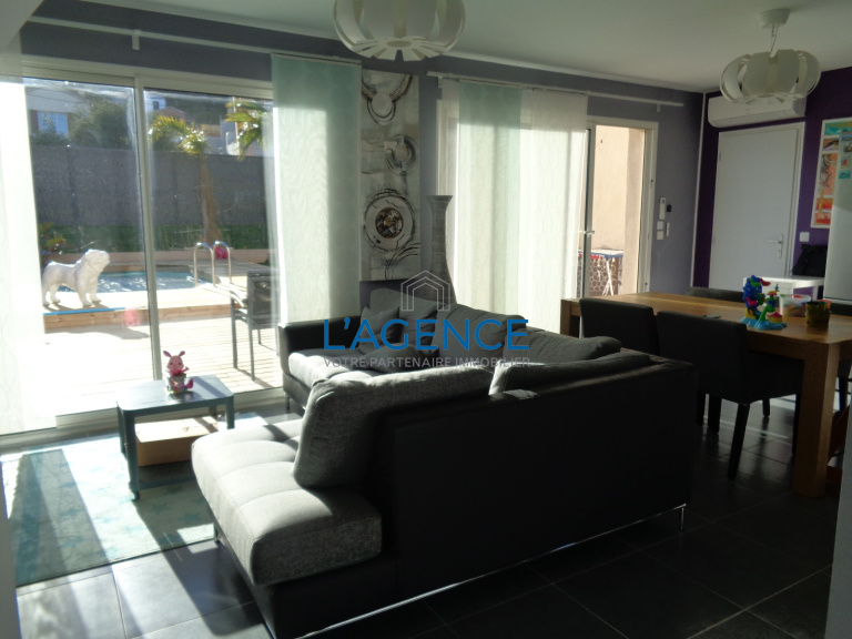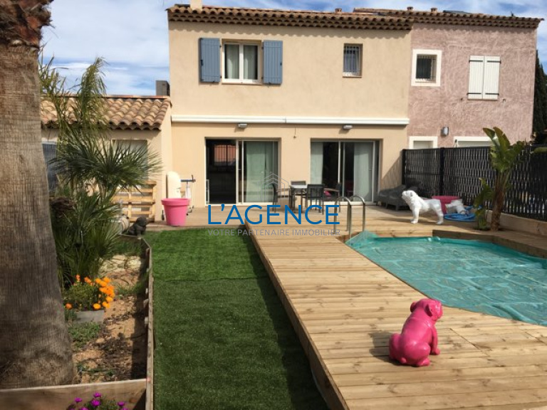 Hyères Secteur Almanarre , Villa récente de 2015 de type T3/4 sur deux niveaux exposée au sud mitoyenne d'un seul coté . Elle se compose d'un vaste séjour cuisine us de 32 m2 baigné par la lumière ouvrant sur une terrasse en teck et une piscine . A l'étage 2 chambres avec placard , bureau , salle d'eau avec wc. Garage , 3 places de parkings privatives. Tres belles prestations : volets électriques, clim réversible, prestations soignées . Terrain de 235m2 . A 2 kilomètres des plages et commerces de la gare .
