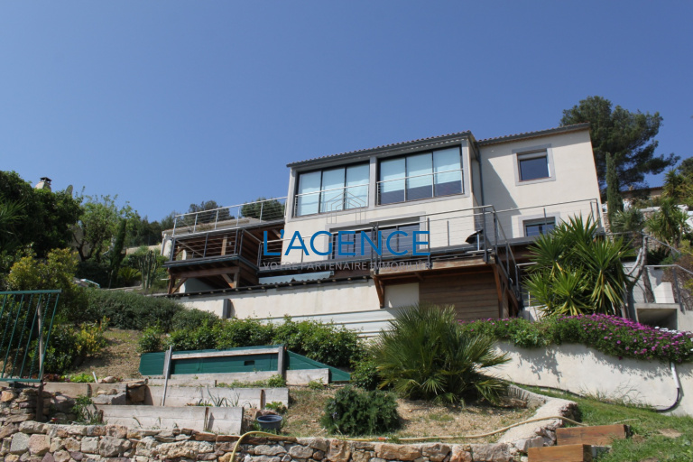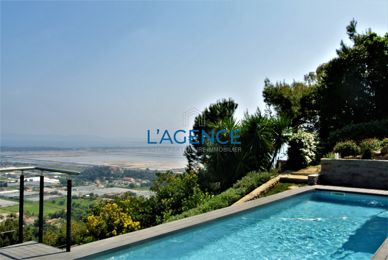 Hyères dans un domaine privé et sécurisé superbe villa contemporiane de 180 m2 offrant une vue sur mer unique . Son vaste séjour cuisine de 80 M2 vous désuira par ses ouvertures sur la mer et sa clarté . Elle bénéficie de 4 chambres dont deux de plain pied avec salle de bains et douche à l'italienne . Au niveau inférieur 2 autres chambres dont une de 43 m2 avec salle d'eau privative ouvrent sur une terrasse tout en bénéficiant de la vue mer . une linegrie complète le tout pour la parti habitable . Son terrain de 1300 M2 entiérement arboré vous donnera accés à une piscine 10X3 et son pool house avec un jardin d'hiver . Garage double . Vous serez séduit par cette rénovation contemporaine ou la vue mer et les prestations tres soignées et haut de gamme de cette villa sont les maitres mots .
