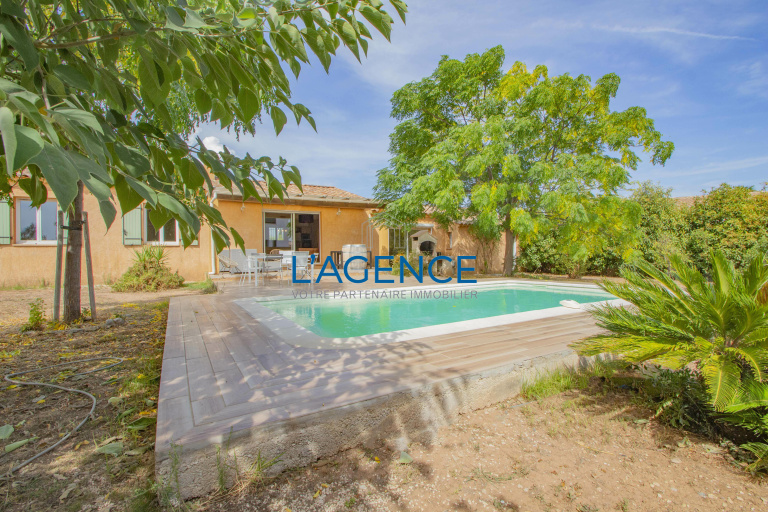 Villa individuelle de plain pied T5 de 140 m² exposée sud ouest, composée d'une entrée et d'un salon séjour salle à manger avec cuisine US de 60 m² ouvrant sur la terrasse et le jardin. Un premier espace nuit dessert 3 chambres avec salle de bains et wc ; un deuxième ouvre sur une suite parentale de 23 m² avec salle d'eau ouvrant également sur le jardin. Cellier. Terrain plat de 1015 m². La terrasse est prolongée d'une piscine de 8x4.Très belle exposition. Double vitrage, climatisation réversible. Nombreuses places de parking dans le jardin Non loin des axes autoroutiers et du village.