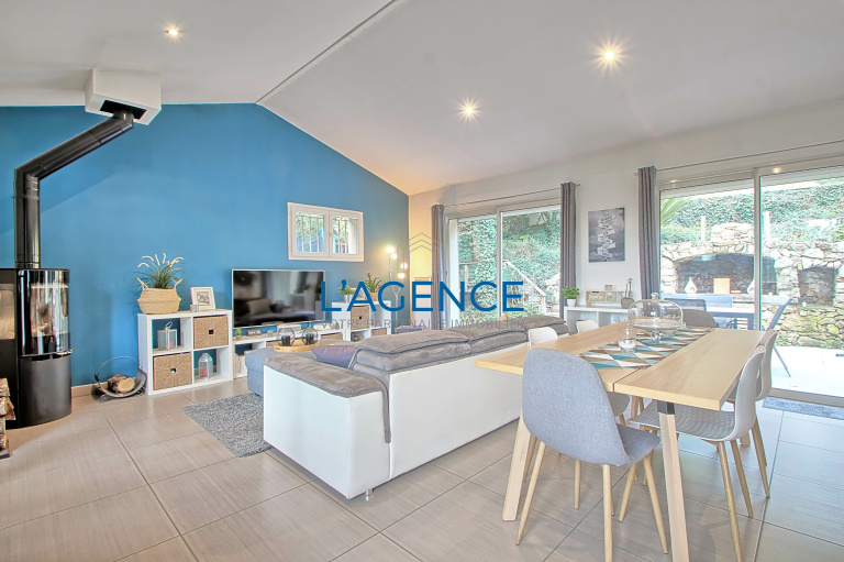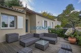 Villa de plain pied en parfait état avec vue dégagée sur la vallée, proche commerces : entrée, séjour double avec cuisine us de 39 M2 ouvrant sur de larges terrasses en IP. 3 chambres dont deux avec placard, dégagement, salle d'eau avec wc. Buanderie. Au niveau inférieur, très belle suite parentale de 32 m2 avec 25 m2 de chambre et 7 m2 de dressing. Jardin arboré de 1003 m2 en 2 restanques : sur le haut du jardin piscine en béton avec liner de 5 x 3. Arrosage automatique. Deux belles terrasses permettent pratiquement de faire le tour de la villa. Abri à bois et espace de rangement.