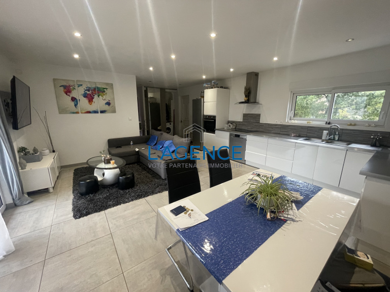 Méounes dans un écrin de verdure villa bioclimatique de type 4 de 82m² sur un terrain de 1092m², comprenant : entrée, séjour ouvert sur cuisine donnant accès à une terrasse exposée sud, trois chambres dont une en suite avec salle d'eau, wc séparé, salle d'eau, terrain piscinable, au calme et très lumineux