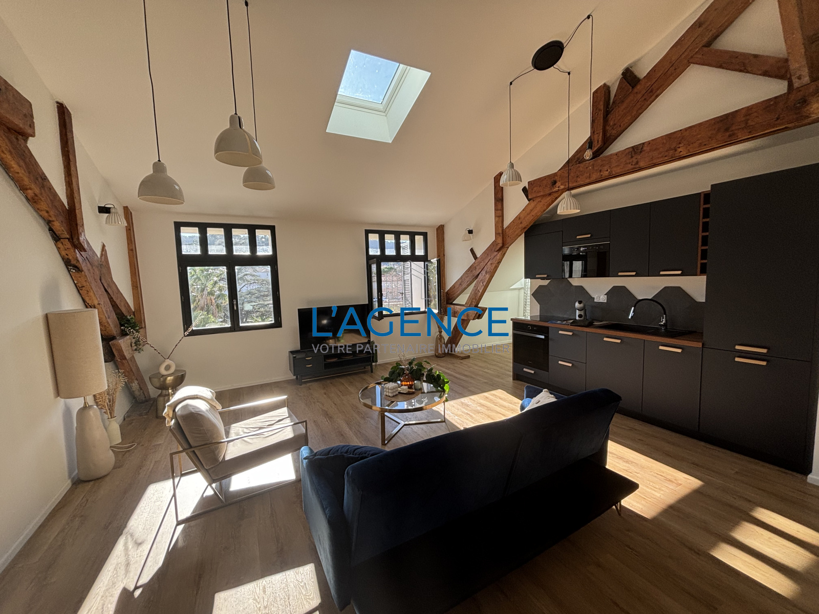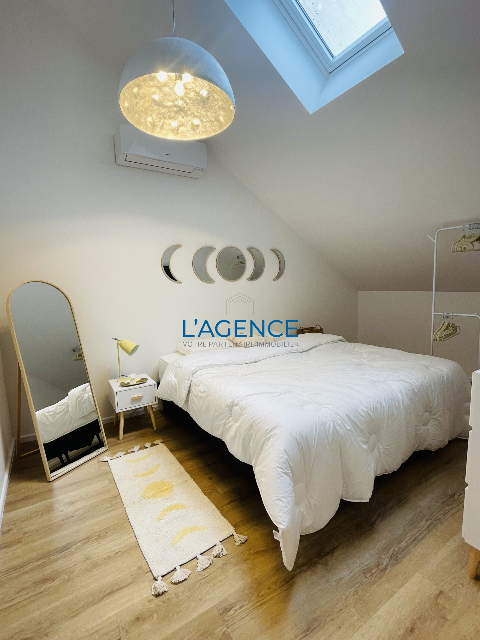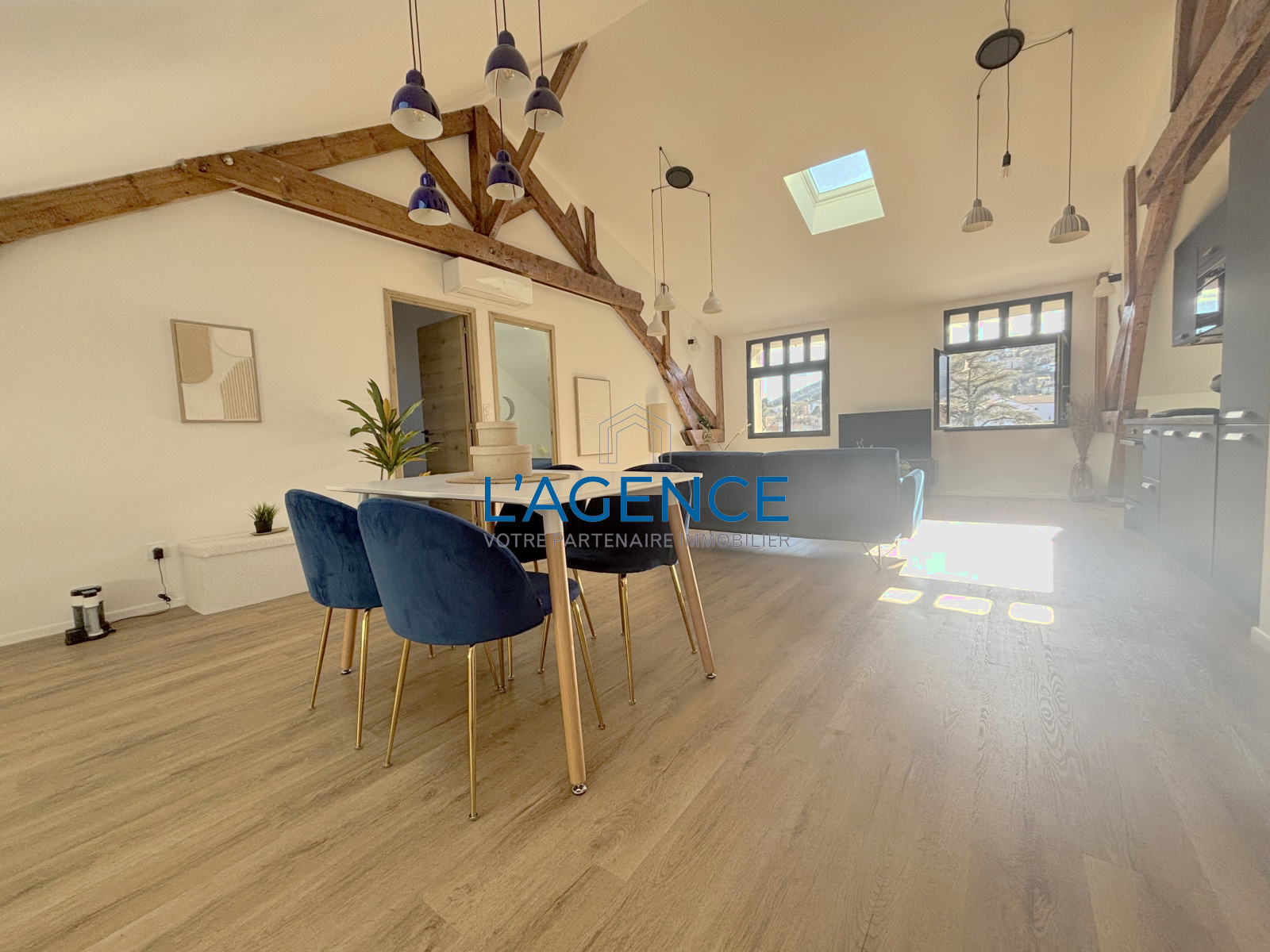 Dès l'entrée un vaste salon séjour salle à manger de 46m² avec cuisine entièrement aménagée et équipée offrant de beaux volumes et un cachet de fou avec les poutres apparentes. 2 Belles chambres avec Vélux électrique, salle d'eau et WC séparé.