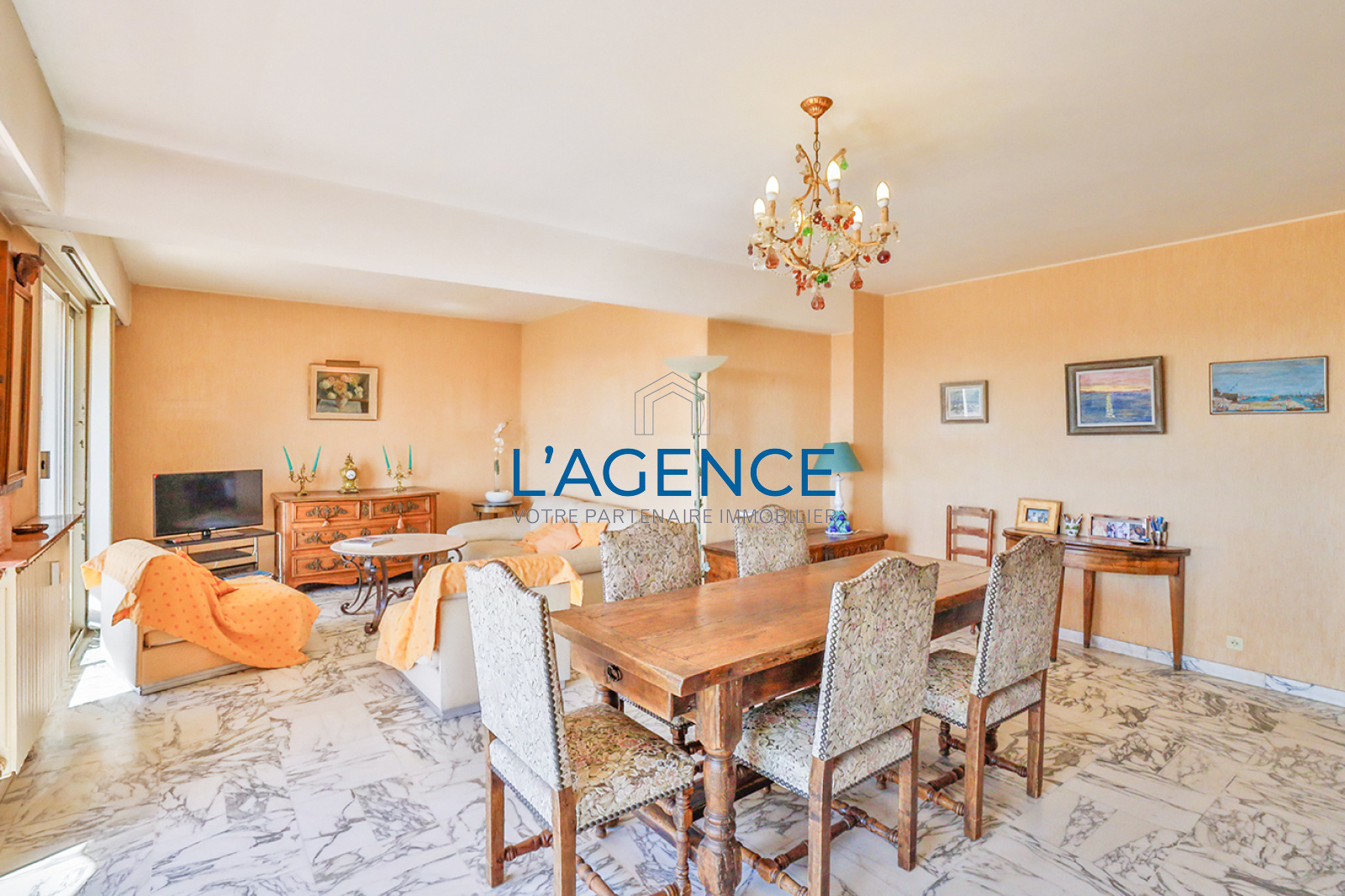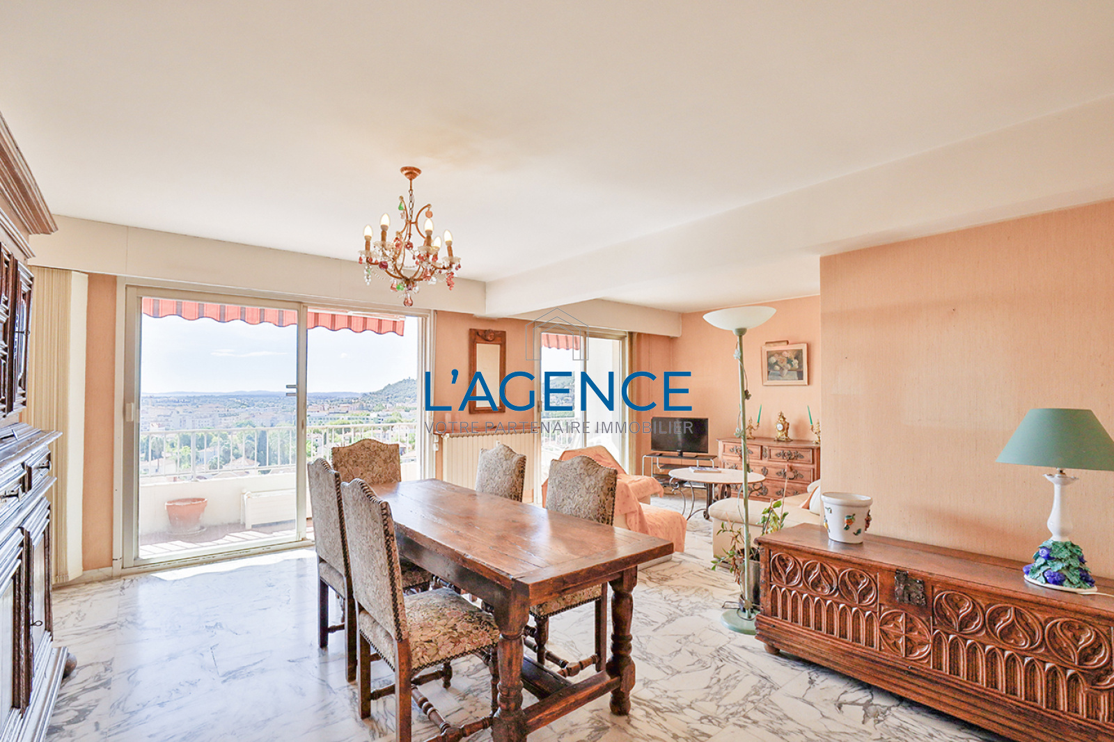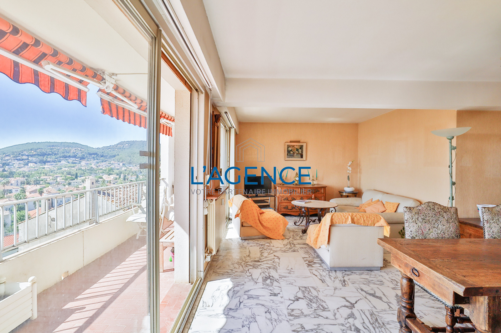 Hyères (83400)Hyères centre ville, Appartement de type T3/4 en dernier étage avec ascenseur et terrasse de 40 m² avec VUE MER. Il se compose d'une belle entrée avec séjour double de 30 m² ouvrant sur une terrasse de 11 m² avec vue dégagée allant jusqu'à la mer. Cuisine séparée ouvrant sur une autre terrasse de 29 m² avec vue dégagée. 2 belles chambres ouvrant sur la terrasse. salle de bains, wc séparé. Cet appartement nécessite des travaux de rafraichissements et de modernisation. Garage au rez de chaussée plus cave. Tres belle vue mer pour un appartement au pieds des commerces