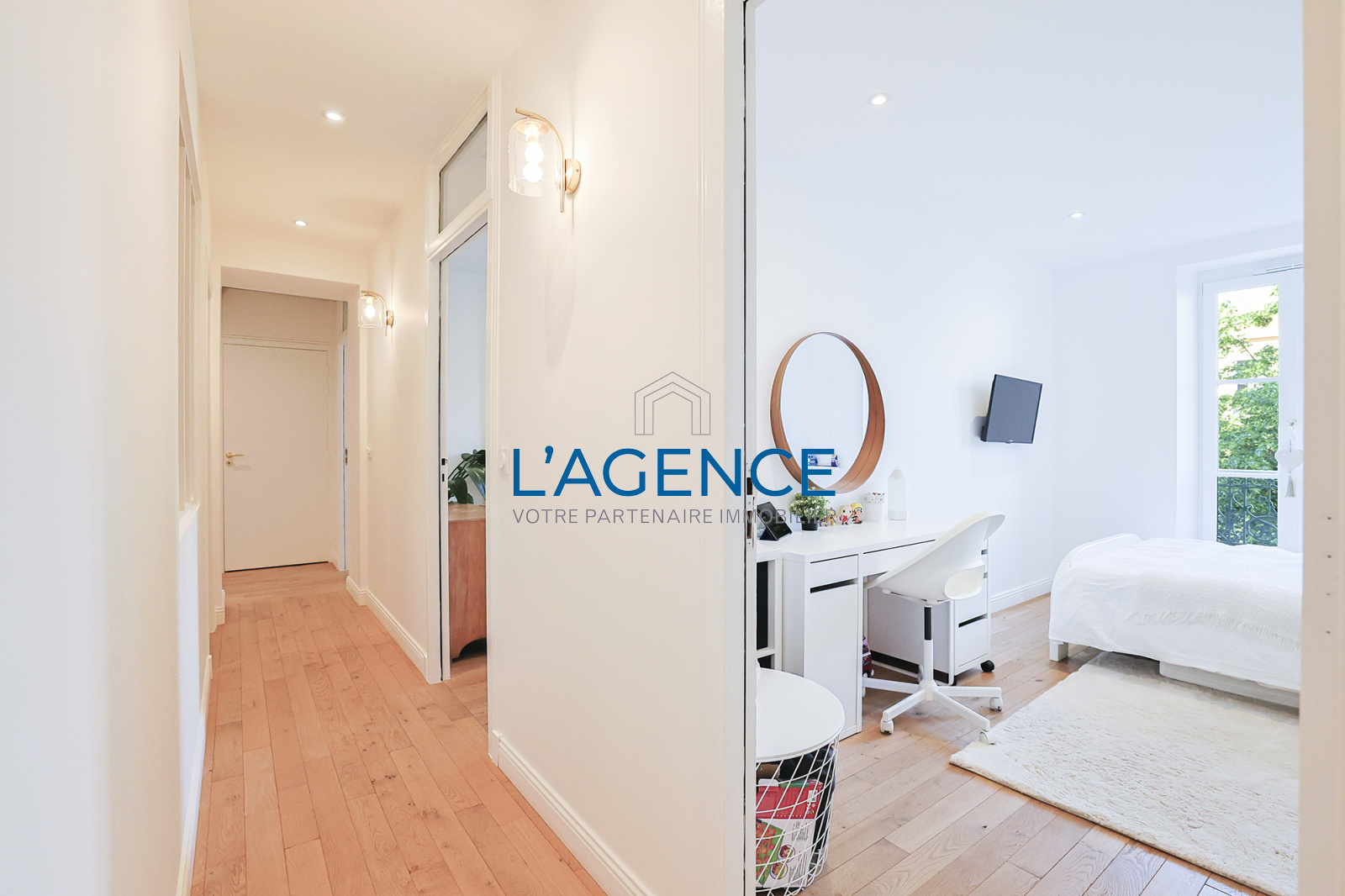 De l'entrée, un couloir dessert 3 belles chambres et un bureau avec verrière pouvant servir de 4 éme chambre. Salle de bains, WC séparé. Salon séjour avec cuisine US aménagée et équipée de 33 m² ouvrant sur une terrasse au Sud de 9 m² au calme sans vis à vis.