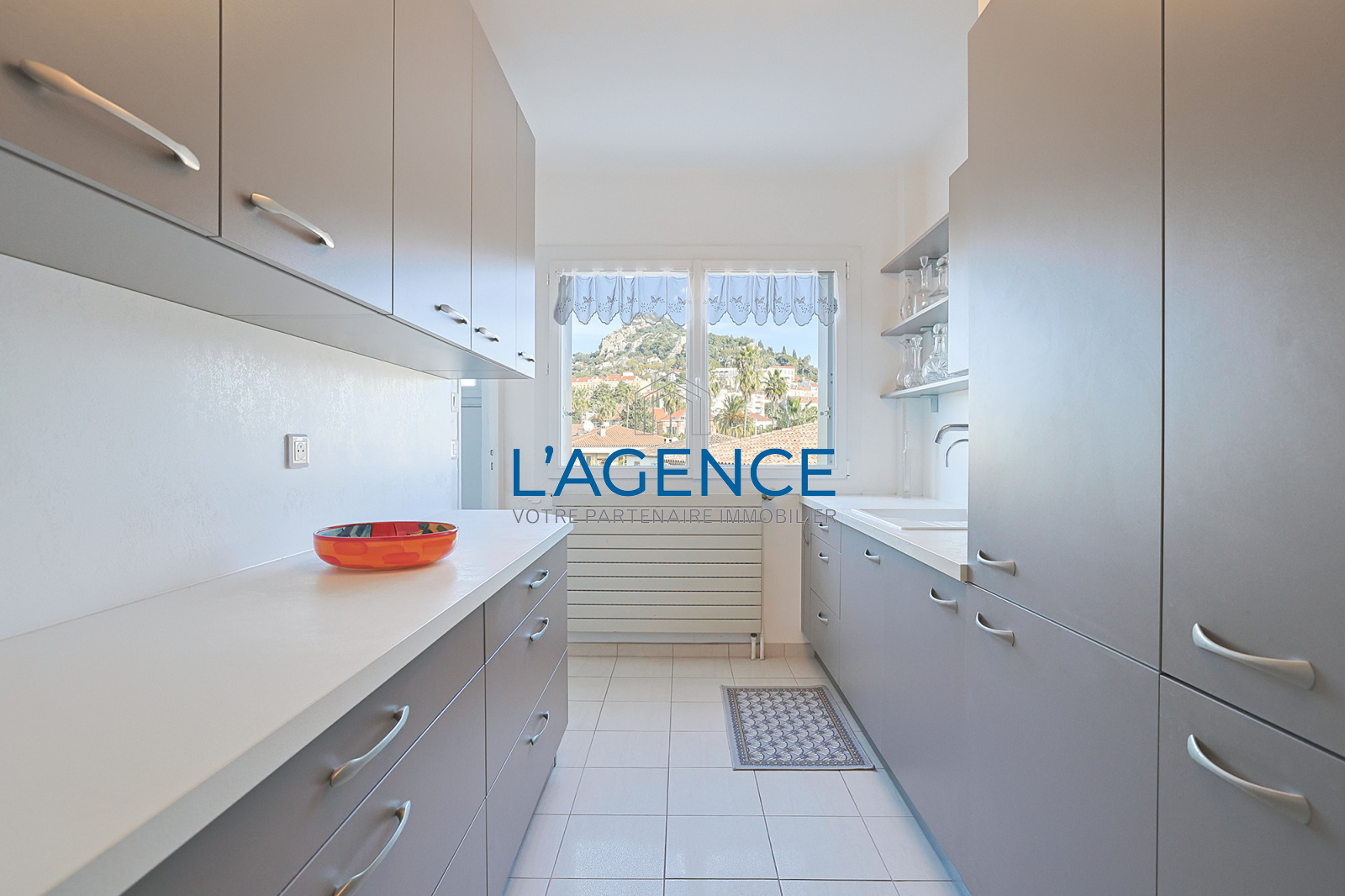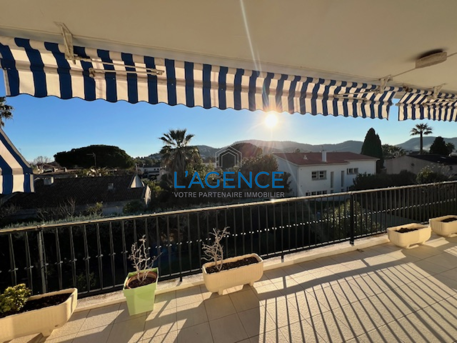 Exposé au Sud et traversant, il bénéficie d'une grande terrasse de 45m2 et d'une belle vue dégagée sur les collines de Costebelle et la vieille ville au Nord, dans un environnement calme et préservé.