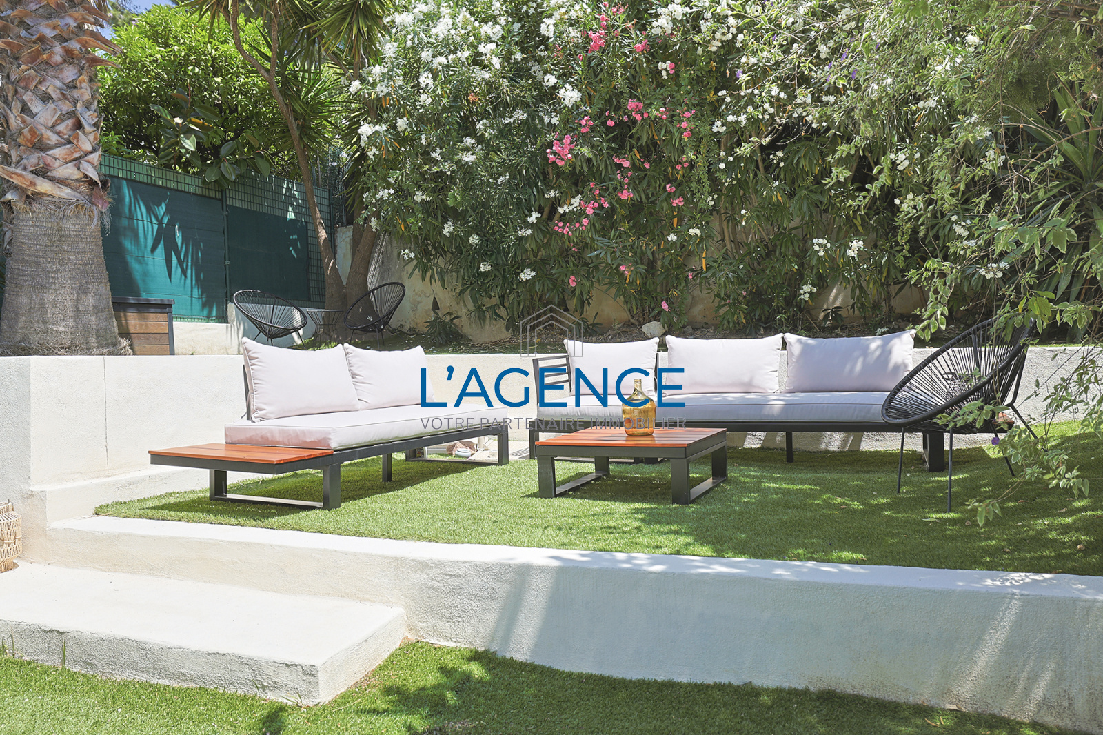 Son jardin de 115 m² est composé de différents espaces, avec différentes ambiances, lieux de vie et de calme dans la verdure, au calme.