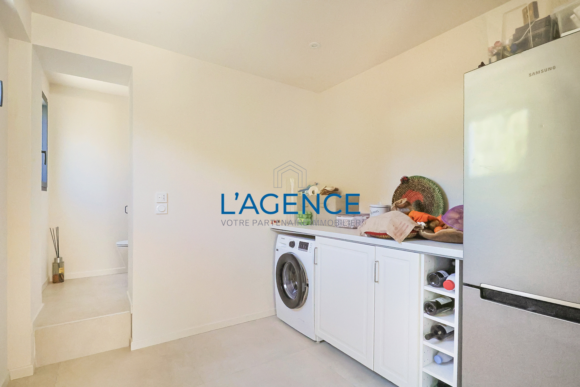 En rez de jardin un beau salon séjour avec sa cuisine ouverte de 53 m² donnant sur les terrasses et la pergola bioclimatique de 8/4,une lingerie cellier avec WC.