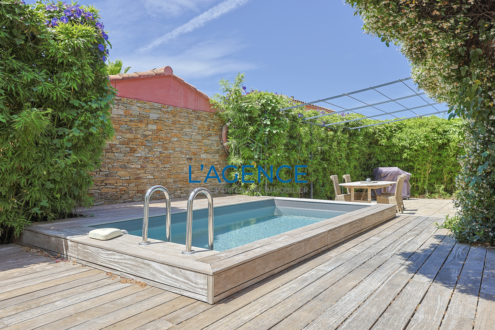 Le jardin arboré donne à cette villa une belle intimité aux abords de la piscine.