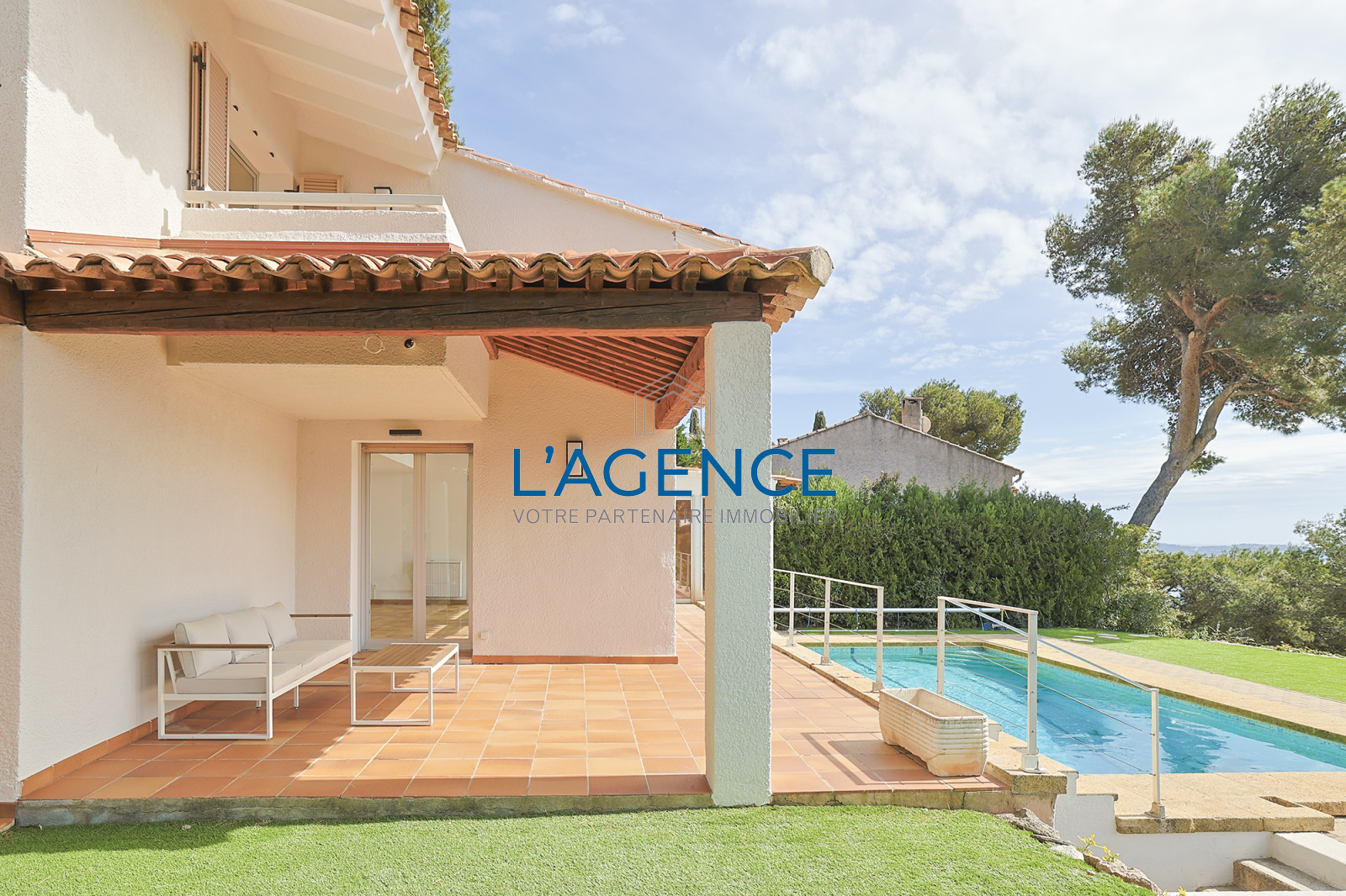 Hyères (83400)HYERES, QUARTIER TRES RESIDENTIEL, superbe villa d'architecte de 223m2 habitables env.plus annexes, sur un terrain de 1867m2 arboré. Trés belle vue dominante mer et entourée de verdure, elle est enveloppée dans la nature et au calme. Piscine sans vis a vis. La propriété offre de beaux volumes et une trés belle vue dégagée sur la verdure environnante et la mer. Elle se compose de 3 chambres dont deux vue mer et une ouvrant sur une tropézienne, un bureau, une mezzanine, des combles aménagés, et dépendances, le tout idéalement situé non loin des plages de Hyères et Carqueiranne, garage double, nécessite des travaux de rafraîchissement intérieur.