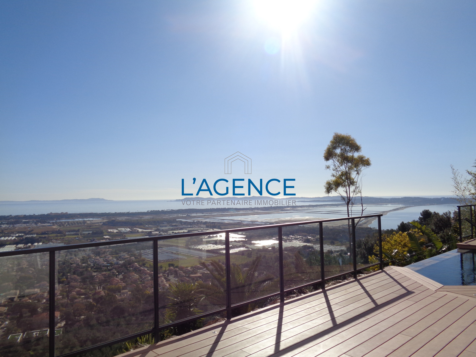 Hyères (83400)Hyères dans un domaine privé et sécurisé superbe villa contemporaine d'architecte de 220 m2 rénovée offrant une sublime vue sur mer et des prestations tres haut de gamme . Cette villa offre un séjour salon cathédrale avec cuisine équipée de 60 m2 ouvrant sur de larges terrasses avec une piscine dans le prolongement . Elle offre 4 chambres dont une suite de plain pied avec salle d'eau et 3 autres chambres à l'étage avec salle de bain . Un appartement de 40 m2 complète l'ensemble des parties habitables .Les deux niveaux sont desservi par un ascenseur intérieur La piscine chauffée et sa terrasse permettent d'accéder à une seconde partie du jardin arboré avec cellier et local pisicne .