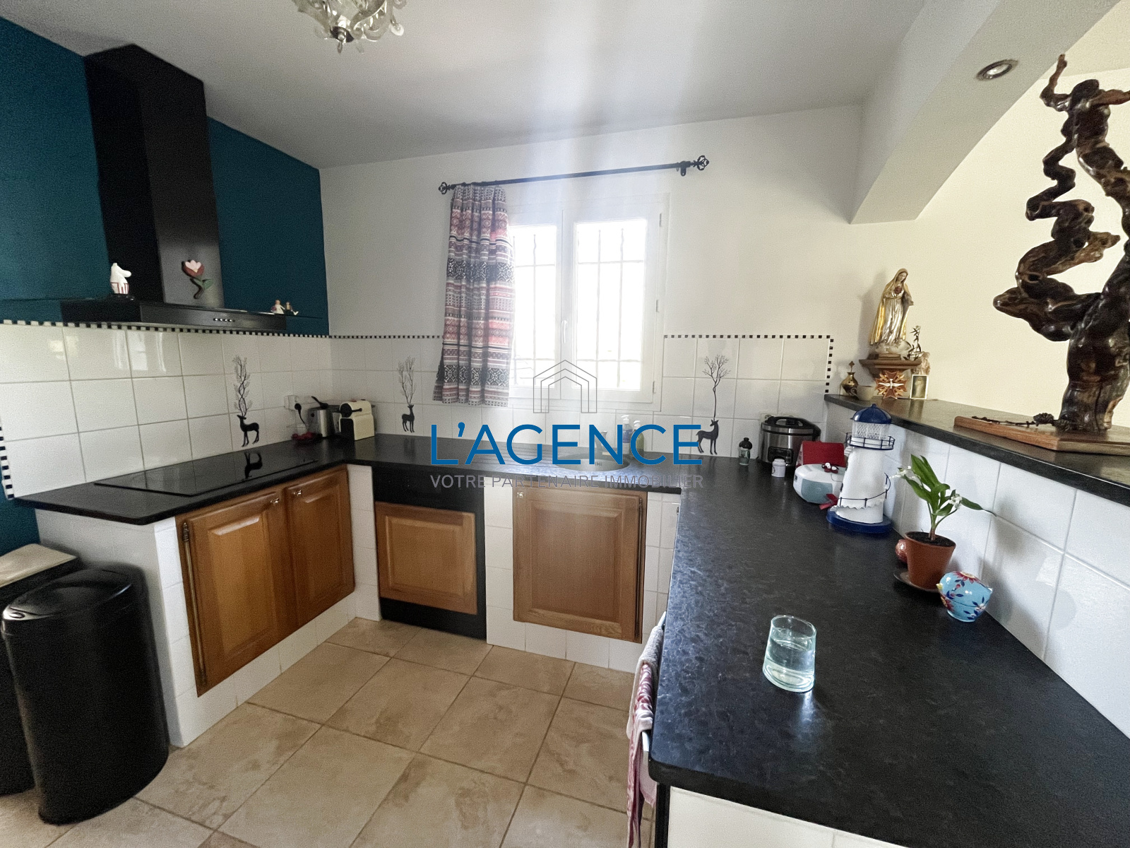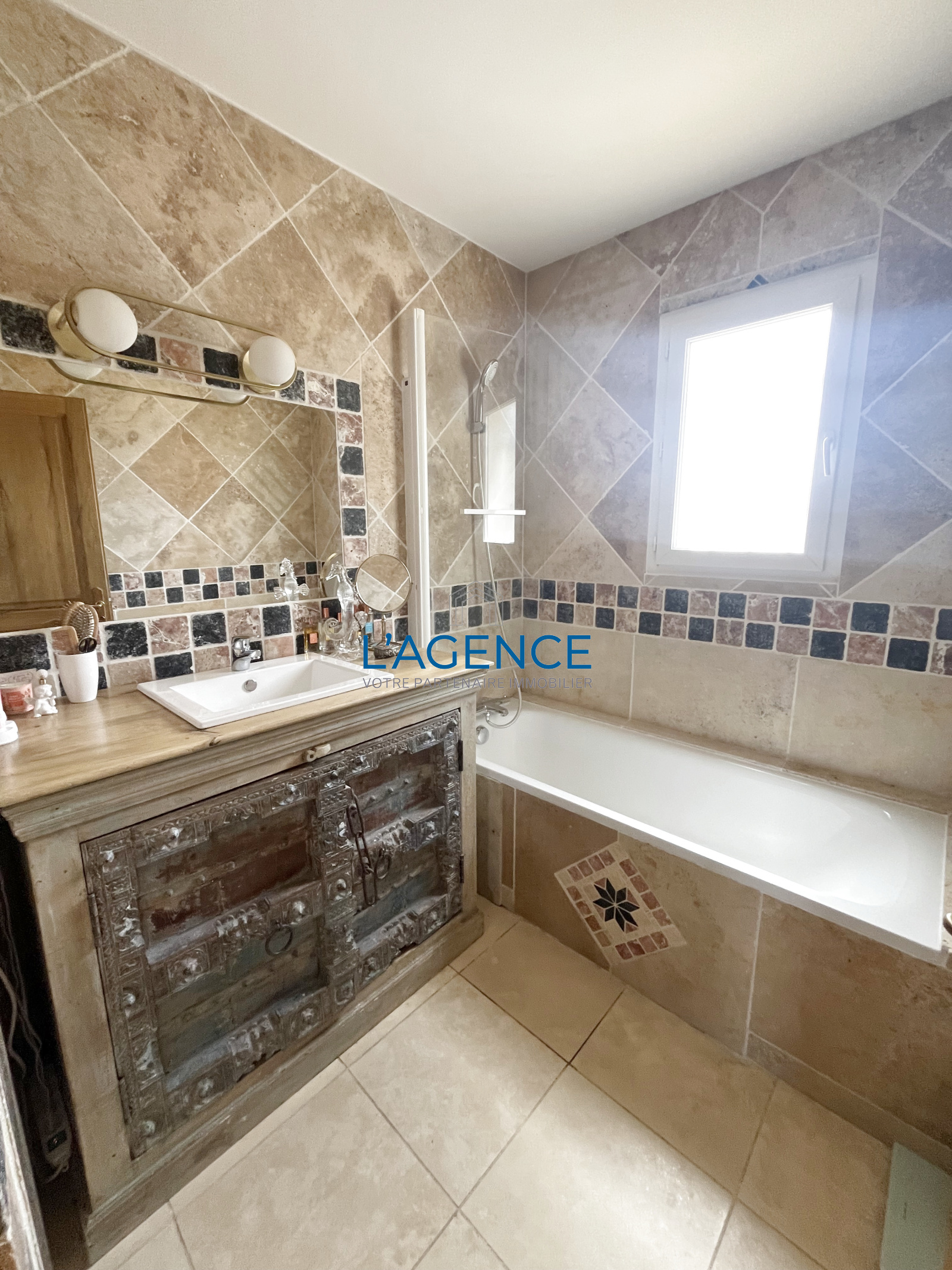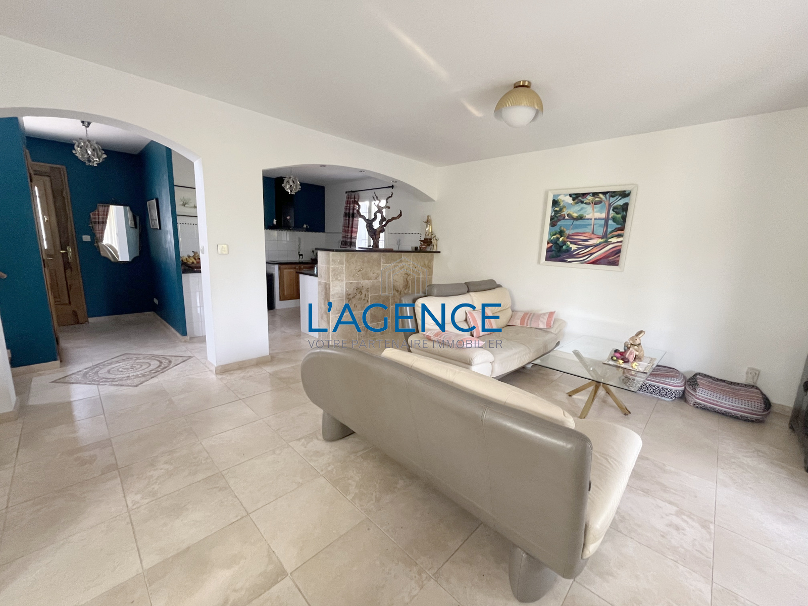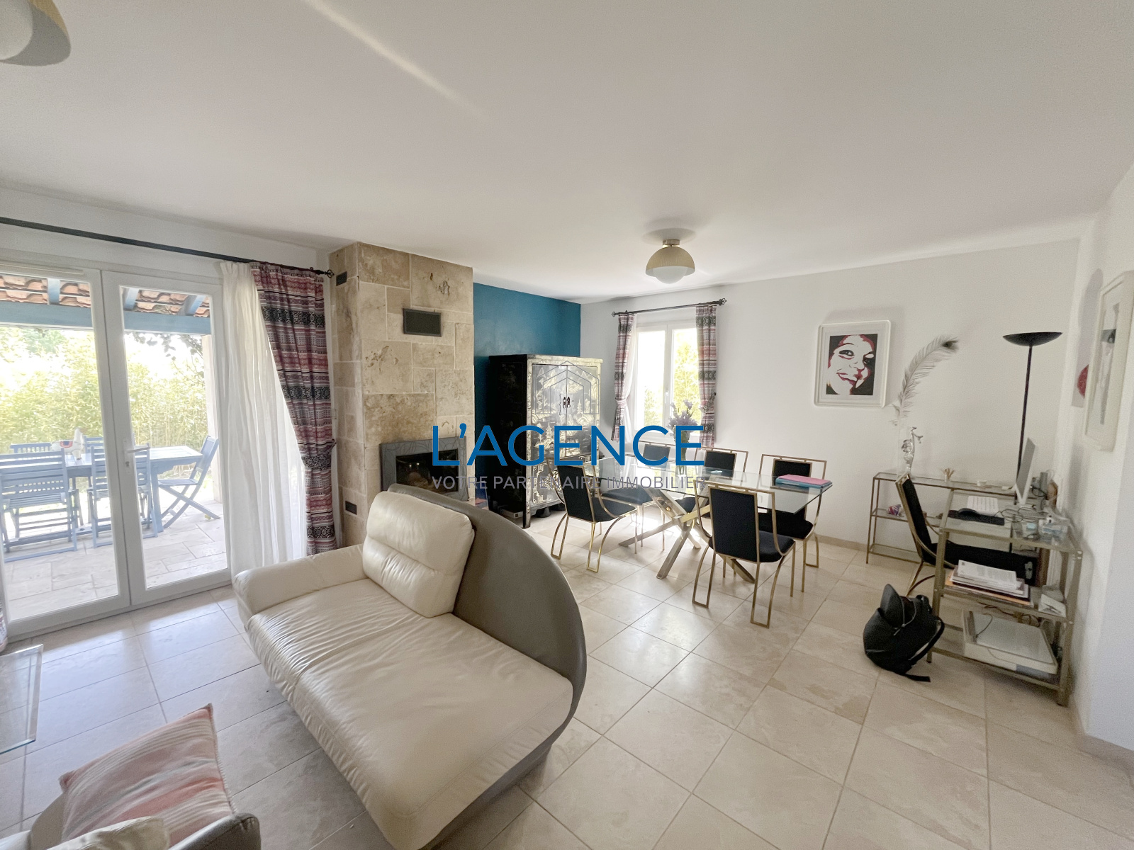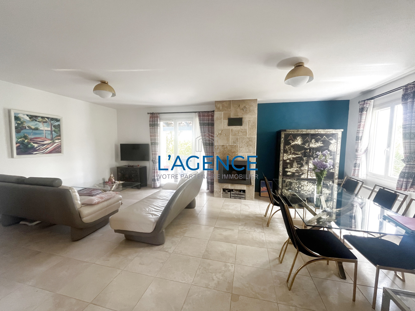 La villa de 104 m2 se compose d'une belle entrée qui ouvre sur un salon séjour avec cuisine de 37 m2 avec cheminée et dans le prolongement une terrasse avec accés au jardin .