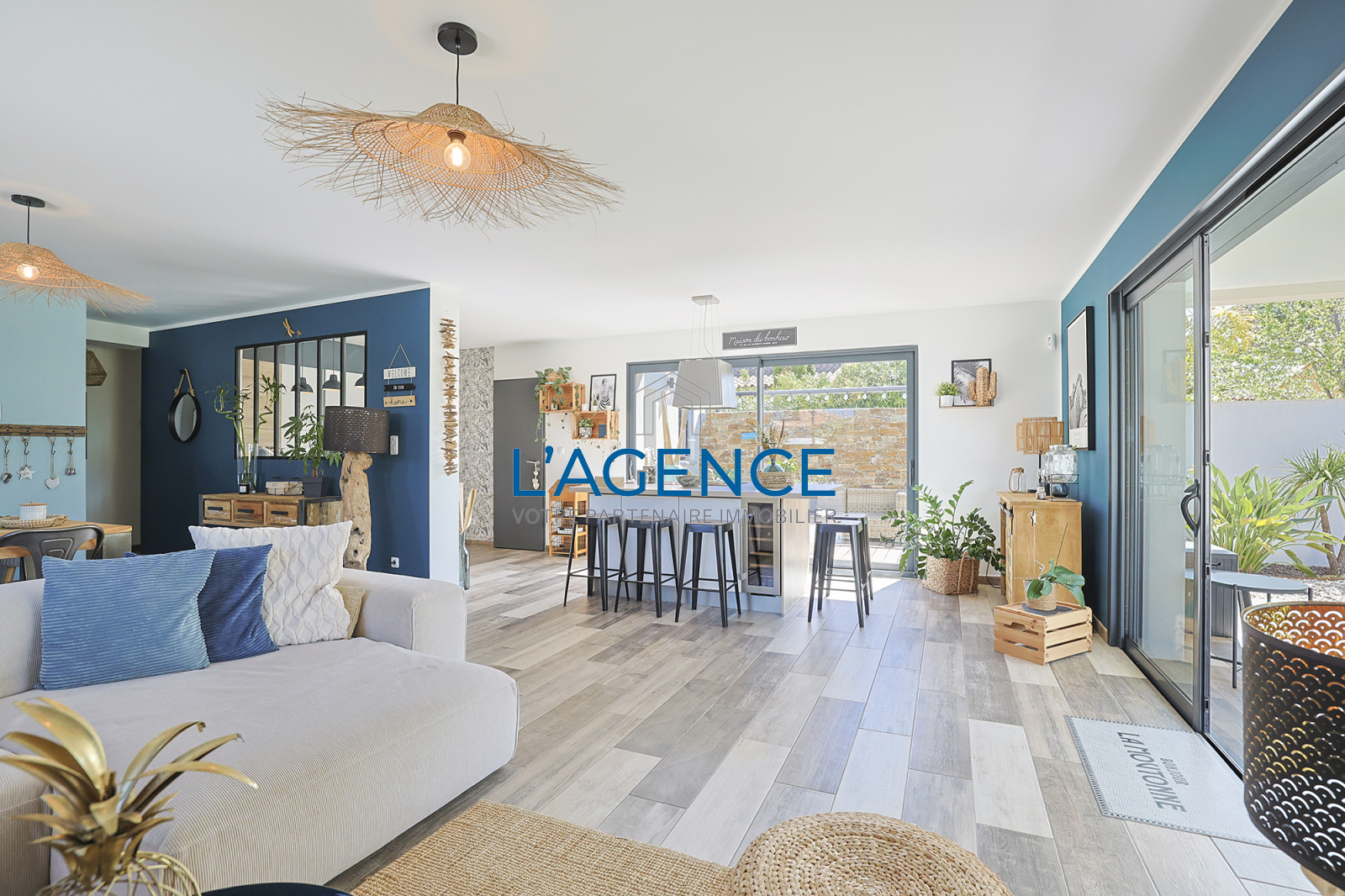 Dès l'entrée vous arriverez sur un vaste salon salle à manger de 52 m² avec une cuisine aménagée et équipée et une grande baie vitrée à galandage ouvrant sur une terrasse de 22m² et un patio. Chambre de plain pied de 17 m² avec salle d'eau privative et dressing.