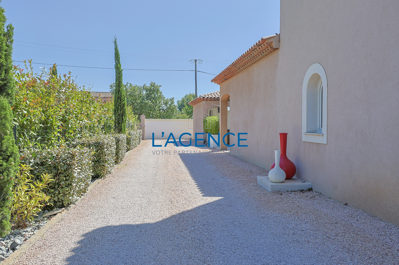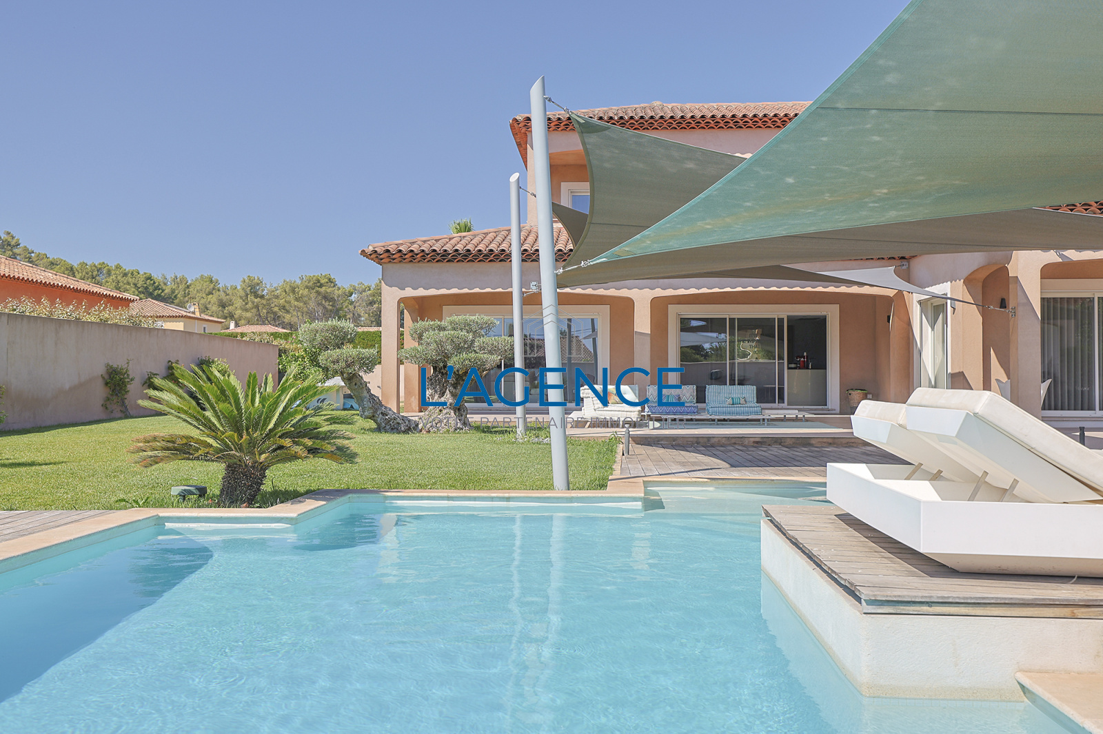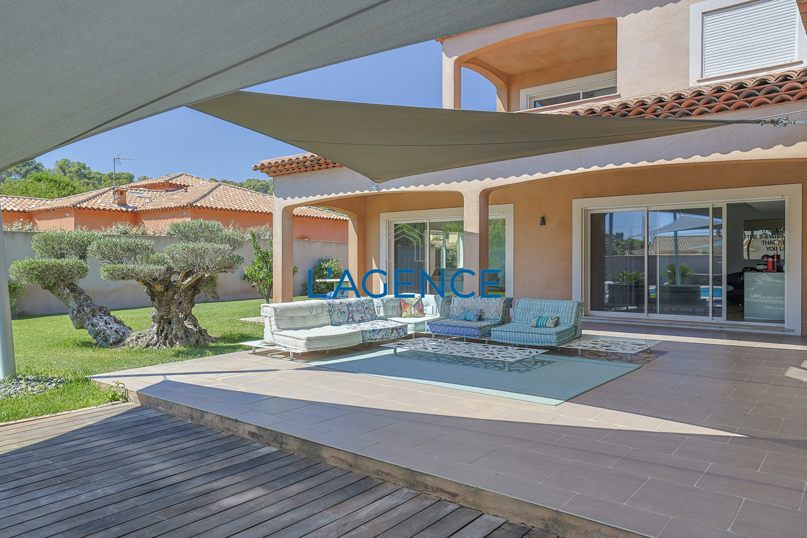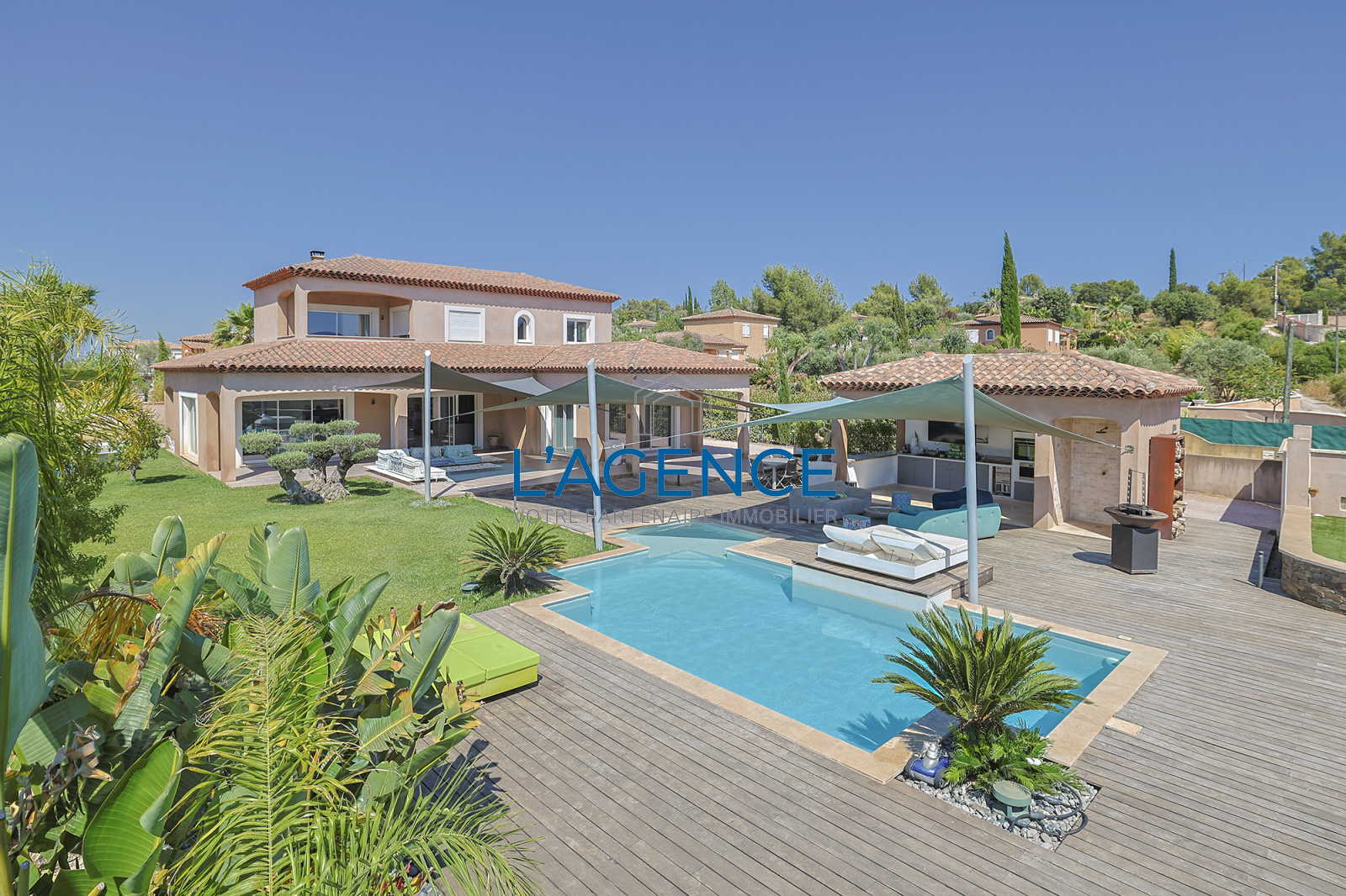 La Crau (83260)La Crau dans un secteur résidentiel au calme et sans vis à vis, villa T5 de 195 m² aux prestations haut de gamme, édifiée sur un terrain plat de 1628 m² avec piscine Pool house garage studio et un terrain entièrement arboré sans vis à vis.